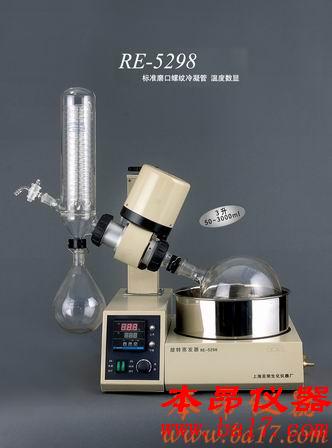 RE-5298旋轉蒸發器用途簡介:旋轉式蒸發器是采用旋轉蒸發瓶(燒瓶),增大蒸發面積在減壓下置于水浴中一邊旋轉,一邊加熱的裝置,使瓶內溶液擴散蒸發。是化學工業,醫藥工業,高等院校和科研實驗室等單位用于制造及分析實驗賴以濃縮,干燥,回收等較為理想的必備基本儀器。